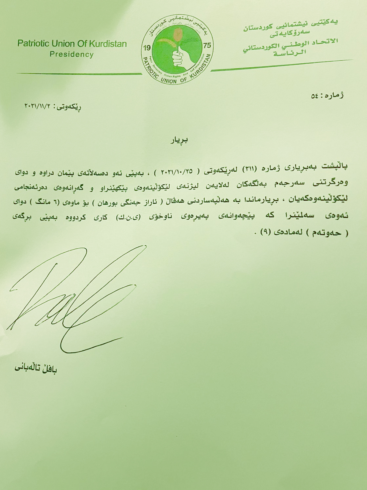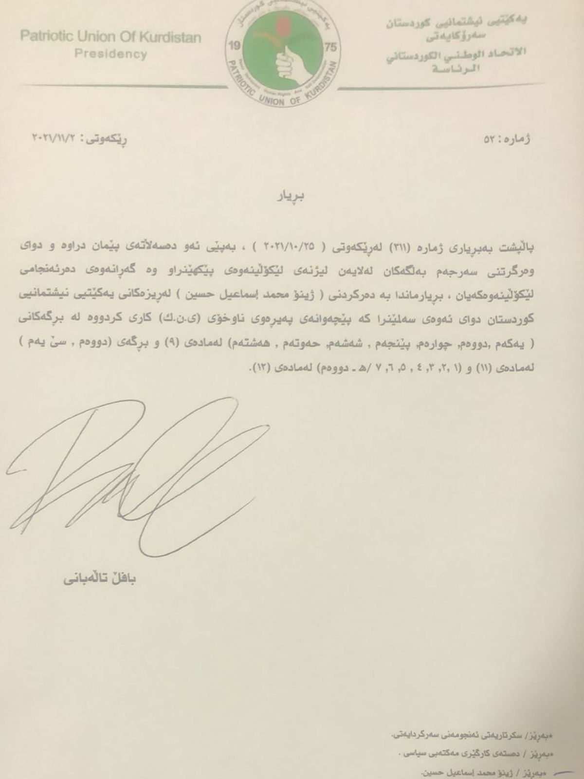 دوێنی بافڵ تاڵەبانی هاوسەرۆكی یەكێتی بڕیاری دەركردنی بۆ لاهور شێخ جەنگی و سێ ئەندامی سەركردایەتی دەركرد و بڕیاری هەڵپەساردنی بۆ ئاراس شێخ جەنگی دەركرد.