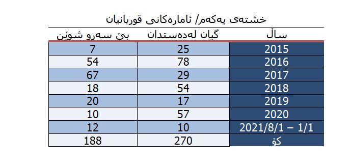 ئامارەکانی قوربانیانی عێراقی کە لە ڕێگای کۆچی نائاسایدا لەماوەی (2015-2021) بوون بە قوربانی و زۆرینەیان خەڵکی هەرێمی کوردستانن و (458) کەسن، (بڕوانە خشتەی یەکەم).