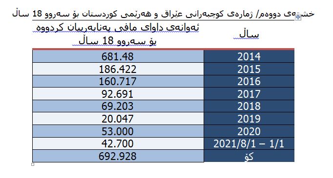 هاوکات هەر بەپێی ئامارەکانی دەزگای ناوبراو لە ماوەی نێوان ساڵی (2014-2021) لە عێراق و هەرێمی کوردستان نزیکەی (693) هەزار عێراقی داوای مافی پەنابەرییان لە وڵاتانی ئەوروپا کردووە، بەدەر لەو کۆچبەرانەی تەمەنیان لە خوار (18) ساڵەوەیە یان داوانامەی سیاسییان پێشکەش کردووە، (بڕوانە خشتەی دووەم).
