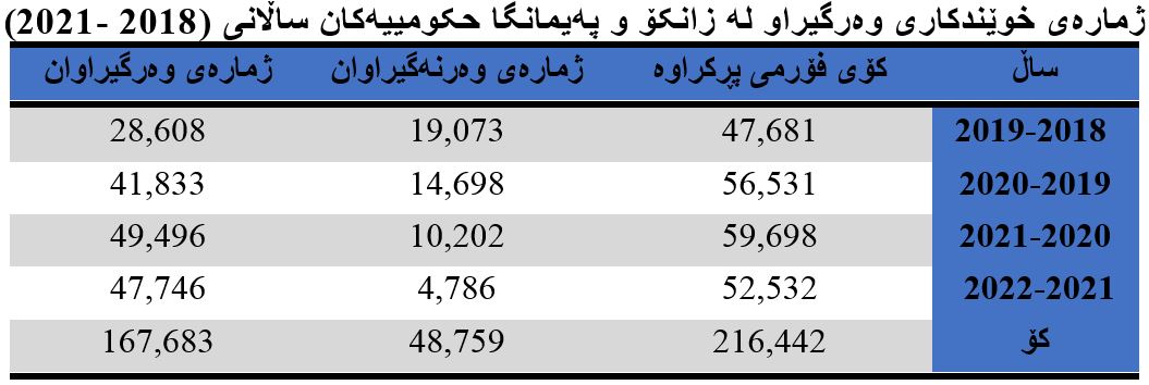 بەپێی داتاکانی وەزارەتی خوێندنی باڵا لە چوار ساڵی ڕابردوودا (167 هەزار و 683) خوێندکار لە زانکۆ و پەیمانگا حکومییەکان وەگیراون، بەڵام پێویستە تێبینی ئەوە بکرێت بەشێک لە ژمارەیە لە ئێستاد خوێندنیان تەواو کردووە، بەتایبەت ئەوانەی پەیمانگاکانیان خوێندووە، بۆیە کۆی ئەو ژمارەیەی سەرەوە لە ئێستادا کەمترە، وەرگرنی خوێندکارانیش بەم جۆرە بووە؛ (بڕوانە خشتەی ژمارە (4))
