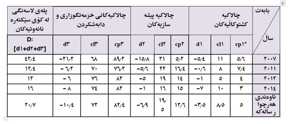 خشتهی (3) ڕێژەی بهشداریی چالاكیه ئابوریهكانی نانهوتی له پێكهێنانی كۆبهرههمی ناوخۆیی و وهخۆگرتنی هێزی كار وپلهی لاسهنگیه پهیكهریهكان له ههریمی كوردستان بۆ چهند ساڵیك له(2007-2014)