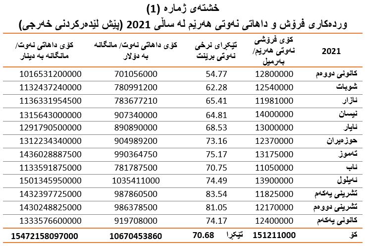 سەبارەت بە كۆی گشتی فرۆشو داهاتی نەوتی هەرێم لە ساڵی (2021)دا، حكومەتی هەرێمی كوردستان (151 ملیۆنو 211 هەزار) بەرمیل نەوتی هەناردە كردووە، تێكڕای نرخی نەوت لە ساڵەكەدا بریتی بووە لە (70.68) دۆلاری ئەمریكی (بڕوانە خشتەی ژمارە (1)).