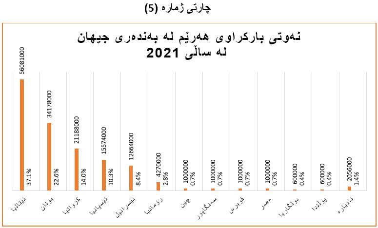لە ساڵی (2021)دا نەوتی هەرێم لە بەندەری جەیهانی توركی لەلایەن كەشتی (12) وڵاتەوە باركراونو زۆرترین باركردن كەشتییە ئیتالییەكان كردووەیانە كە (56 ملیۆنو 81 هەزار) بەرمیل نەوت بووە، بە ڕێژەی (37.1%)، كەمترین بڕی باركراویش كەشتی پۆڵندیو بولگارییەكان بووە كە بڕەكەی (600 هەزار) بەرمیل بووە بە ڕێژەی (0.4%) بووە. (خشتەی ژمارە (3) و چارتی ژمارە (5)).