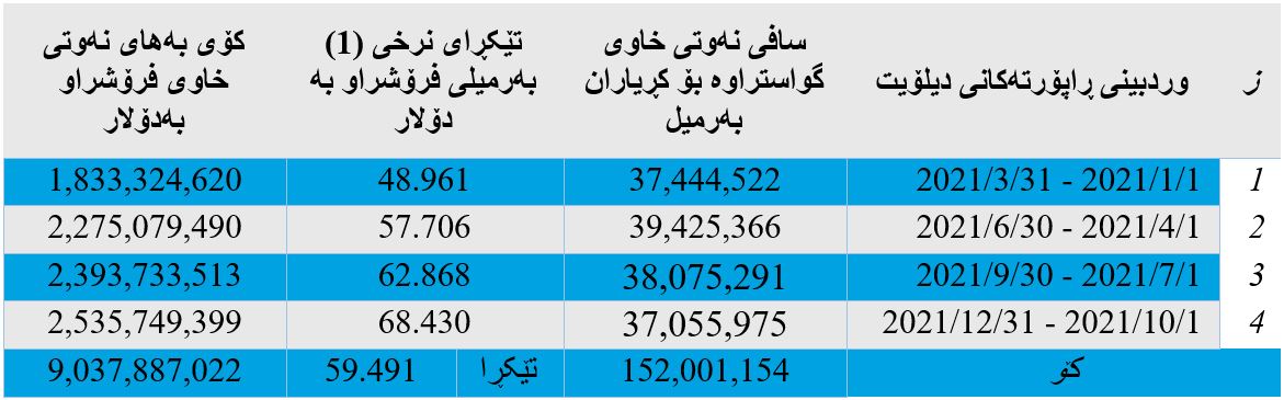 - بەرهەمی نەوت و هەناردە و بەکاربردن و داهات لە ماوەی ١ی تشرینی یەکەمی ٢٠٢١ تاکو٣١ کانونی یەکەمی ٢٠٢١؛