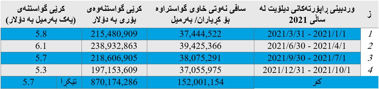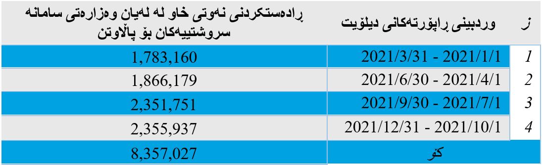 - بەرهەمی نەوت و هەناردە و بەکاربردن و داهات لە ماوەی ١ی کانونی دووەمی ٢٠٢١ تاکو ٣١ی ئاداری ٢٠٢١؛