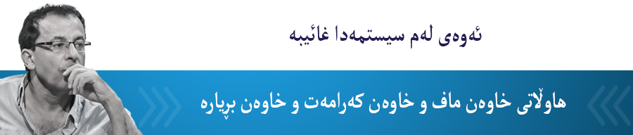 ئەوەی لەم سیستمەدا غائیبە هاوڵاتی خاوەن ماف و خاوەن کەرامەت و خاوەن بڕیارە. کەسانی خاوەن ماف، بە تایبەتی مافی یاسایی، دەکرێت خۆیان لە بەرامبەر ئەو ناهەقییە گەورانەی بەرامبەریان دەکرێت، لەڕێگای یاساکانەوە بپارێزن. بەڵام ئەمە دۆخی هەرێم و دۆخی کۆمەڵگاکە نییە. بۆیە مەسەلەی پاراستنی کەرامەت مەسەلەی مژدەدان نییە بە ژیان و مردن بەیەکەوە. بەڵکو، بەر لە هەمووشتێک، مەسەلەی یارینەکردنە بە بژێو و سەرچاوە مادییەکانی ژیانی بەشەکی گەورەی خەڵک لە کۆمەڵگاکەدا. کەرامەت کاتێک مانای هەیە کە ئامرازەکانی پاراستن و نرخاندنی ئەو کەرامەتە بوونی هەبێت. دەنا دەگۆڕێت بۆ دەستەواژەیەکی بێمانا کە دوو ئەرکی سەرەکیی دەبینێت: شاردنەوەی ناشیرینیەکانی دۆخەکە و شاردنەوەی بکەرە سەرەکییەکانی دروستکردنی ئەو دۆخە.