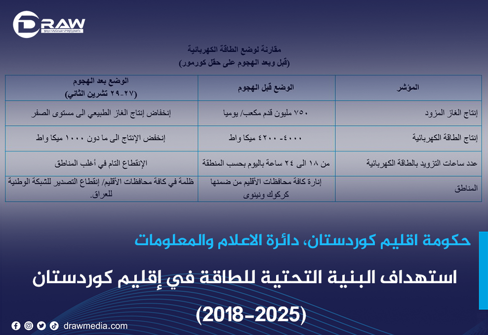 معلومات وتبعات اقتصادية حکومة اقلیم کوردستان، دائرة الاعلام والمعلومات مقدمة واجه قطاع الطاقة في إقليم كوردستان، الذي يُعدّ جزءًا لا يتجزأ من منظومة الطاقة الوطنية في الإقليم والعراق، بل والعالم، سلسلة من الإستهدافات الممنهجة باستخدام تقنيات عسكرية متطورة. وقد تحوّلت طبيعة هذه الإستهدافات من مجرد إزعاجات محدودة في عام 2018، إلى ضربات دقيقة باستخدام الصواريخ الباليستية والطائرات المسيّرة بحلول عام 2025. يهدف هذا التقرير إلى تسليط الضوء على حجم الأضرار المادية والبشرية، وأنواع الأسلحة المستخدمة في هذه الإستهدافات، وتسليط الضوء على العقبات التي تواجه أمن الطاقة وبيئة الاستثمار في جميع أنحاء البلاد، بعيدًا عن أي قراءات سياسية. أولاً: التسلسل الزمني وتطور شكل الاستهداف بشكل عام، تُقسّم الهجمات إلى أربع مراحل مختلفة، تُظهر هذه المراحل تغيرات في أنواع الأسلحة والأهداف: المرحلة الأولى (2018-2021): في هذه المرحلة تم استهداف المناطق المحيطة بالحقول والمصافي بهجمات متقطعة وغير دقيقة باستخدام صواريخ الكاتيوشا، دون الحاق أية أضرار تذكر بالبنية التحتية. المرحلة الثانية (2022): شهد عام 2022 نقطة تحول، حيث استُخدمت صواريخ باليستية ثقيلة لإستهداف منازل المستثمرين في قطاع الطاقة: - 13-مارس-آذار-2022: قصف منزل المستثمر باز كريم برزنجي (المدير التنفيذي لمجموعة كار) باثني عشر صاروخًا باليستيًا، مما أدى إلى تدمير منزله السكني بالكامل، في سابقة تُهدد الرأسمال الوطني. - نيسان وأيار 2022: استهدفت صواريخ غراد وطائرات مُسيّرة مصفاة كلك، وقد أُطلقت هذه الصواريخ من مناطق قريبة من سهل نينوى، وألحقت أضرارًا بمستودعات الوقود. المرحلة الثالثة (2023-2024): استهداف مباشر لسبل العيش والإنتاج - 15 كانون الثاني 2024: قصف باليستي لمنزل رجل الأعمال بيشرو دزيي، الرئيس التنفيذي لمجموعة فالكون، والذي أسفر عن استشهاده و بما في ذلك ابنته الرضيعة، وجرح أفراد عائلته وأشخاص مدنيين كانوا في ضيافته. - 26 نيسان 2024: أول ضربة جوية على حقل كورمور الغازي بطائرة مسيرة مفخخة، أسفرت عن مقتل أربعة عمال أجانب وتعليق العمليات مؤقتًا. المرحلة الرابعة (2025): استهدفت حقول النفط وتعطيل قطاعي الكهرباء بشكل كامل. • تموز 2025 (هجوم بسرب من الطائرات المُسيّرة): تعرضت خمسة حقول نفطية (خورملە، سرسنك، بيشخابور، تاوکی وشيخان) لهجمات متزامنة، مما أدى إلى تعطيل إنتاج حوالي 220 ألف برميل يوميًا. • 26 تشرين الثاني 2025: ضربة جوية دقيقة على مستودع للغاز المسال المستخدم للاغراض المنزلية (LPG) في حقل كورمور. ثانيا: ملحق المعلومات المصدر؛ حکومة اقلیم کوردستان، دائرة الاعلام والمعلومات