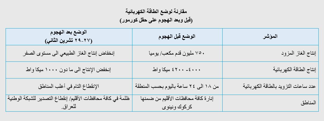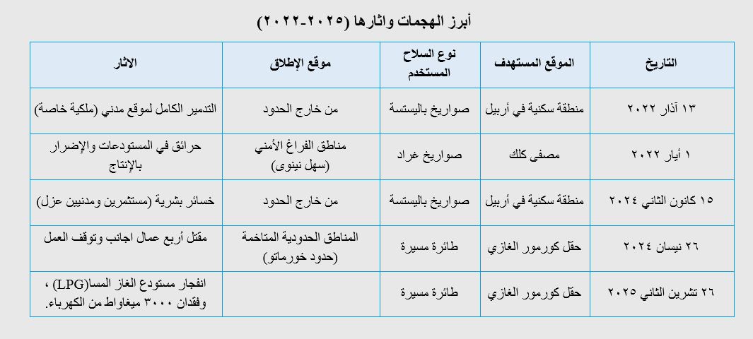 •  26 تشرين الثاني 2025: ضربة جوية دقيقة على مستودع للغاز المسال المستخدم للاغراض المنزلية (LPG) في حقل كورمور.
