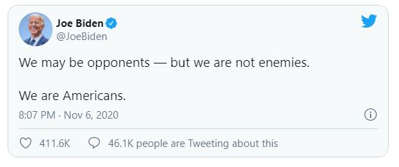وكتب بايدن على تويتر قائلا: "ربما نكون خصوماً ..لكننا لسنا أعداء .. نحن أمريكيون"