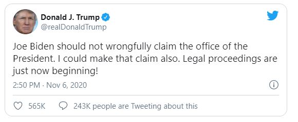وجدد الرئيس الأمريكي الاتّهامات بحصول عمليّات تزوير، دون أن يقدّم أيّ دليل عليها. وقال أمام صحافيين في البيت الأبيض "إذا أُحصيت الأصوات القانونية أفوز بسهولة. إذا أحصيت الأصوات غير القانونيّة، يمكنهم أن يحاولوا أن يسرقوا الانتخابات منا".