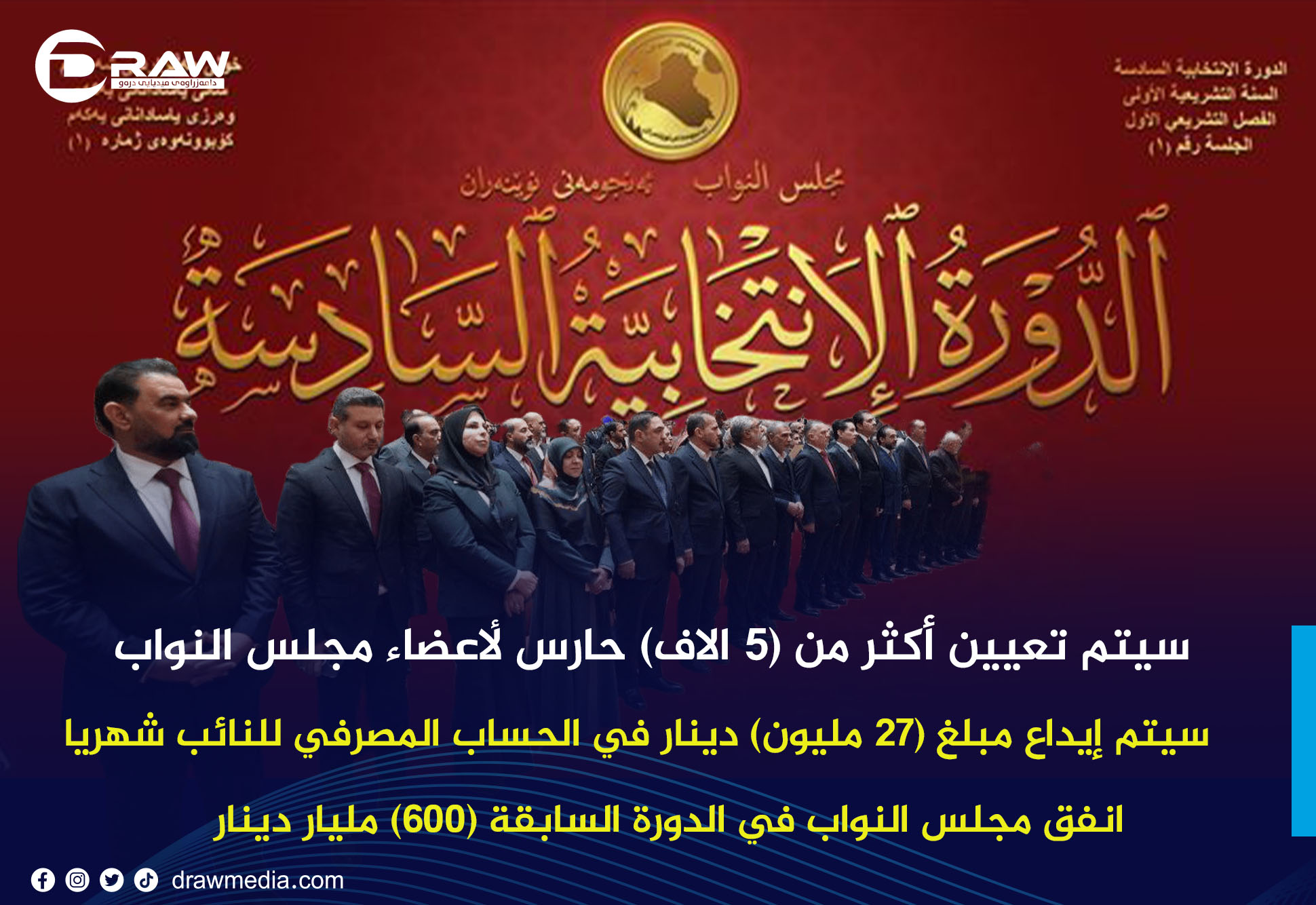 عربيةDraw: سيحصل كل نائب في مجلس النواب العراقي منذ اليوم الذي أدى فيه اليمين الدستورية ولمدة (4) سنوات على راتب شهري قدره (8 ملايين و200 ألف) دينار، و(16 مليون) دينار لـ (16 حارسًا)، و(3 ملايين) دينار لإيجار منزل أو شقة، وسيتم إضافة ما مجموعه (27 مليون و200 ألف) دينار شهريًا إلى حساباتهم المصرفية، ومن يوم أداء اليمين، سيتم تعيين (5 ألاف و 165) حارسًا للبرلمانيين، ليصل إجمالي رواتبهم إلى ( 5 مليارات و316 مليون) دينار شهريًا. في 29 كانون الثاني 2025، أدى النواب العراقيون اليمين الدستورية، اعتبارًا من ذلك اليوم، ولمدة أربع سنوات، سيتم صرف جميع الامتيازات لهم يتألف البرلمان العراقي من (329) نائبًا، ورئيس، ونائبين للرئيس، وعدد كبير من المستشارين والموظفين، وبلغ إجمالي إنفاق البرلمان العراقي للعام الماضي 2025 أكثر من (600) مليار دينار، وفقًا لتقرير وزارة المالية العراقية. سيتم تخصيص (16) حارسًا لكل عضو من أعضاء البرلمان، و(40) حارسًا لرئيس البرلمان و(30) حارسًا لكل نائب رئيس البرلمان. - 326 نائبًا (5 الاف و 216) حارس   - رئيس البرلمان (40 حارسًا) -  نائبان للرئيس (60 حارسًا). يحصل كل حارس من هؤلاء على راتب شهري قدره مليون دينار. - المبلغ الإجمالي لرواتب الحراس يقدر بنحو (5 مليار و 316 مليون) دينار راتب عضو مجلس النواب العراقي، مع مخصصاته ونفقاته، سيودع في حساب المصرفي خاص به: 🔹(5 ملايين و 200 الف) دينار، الراتب الأسمي   🔹(3 ملايين)  دينار، مصاريف ضيافة.  وهذا يعني أن إجمالي راتب عضو البرلمان الأسمي مع مع المخصصات  يصل إلى (8 ملايين و200 ألف) دينار. 🔹 16 مليون دينار لـ (16) حارس، هذا المبلغ يتم إيداعه في الحساب المصرفي للنائب، بعض النواب يعيين عدد قليل من الحراس وبرواتب رمزية 🔹 (3 ملايين) دينار بدل إيجار منزل أو شقة. إجمالي المبلغ الذي يودع في الحساب المصرفي لعضو مجلس النواب كل شهر هو ( 27 مليون و 200 الف) دينار المبلغ الإجمالي الذي سيتم إيداعه في الحساب المصرفي لأعضاء مجلس النواب العراقي، شهريا: - العدد الإجمالي لأعضاء البرلمان (326)، المبلغ الذي يودع في حساباتهم شهريا هو(8 مليار و867 مليون و200 ألف دينار) و(106 مليار و406 مليون و400 ألف دينار) سنويًا. -  يبلغ راتب ومخصصات رئيس مجلس النواب مع النثريات حوالي (150 مليون) دينار شهريًا يصل مجموع الرواتب والمخصصات والنثريات لنائب رئيس مجلس النواب إلى حوالي (100 مليون) دينار.  عدد النواب الكورد هو(58) والمبلغ الإجمالي الذي سيتم إيداعه في حساباتهم المصرفية هو(مليار و577 مليون و600 ألف) دينار.  عدد نواب الكتل الكوردية في مجلس النواب العراقي:  - كتلة الحزب الديمقراطي الكوردستاني : 27 نائباً  - كتلة الاتحاد الوطني الكوردستاني : 18 نائباً  - كتلة تيار الموقف الوطني: 5 نواب  - كتلة الاتحاد الإسلامي الكوردستاني: 4 نواب  - كتلة حراك الجيل الجديد: 3 نواب  - كتلة جماعة العدل الكوردستانية: نائب واحد  وسيتم منح كل نائب جواز سفر دبلوماسي.   ماهي الأمتيازات التي يحصل عليها النواب المتقاعدين: -  عضومجلس النواب العراقي المتقاعد، إذا لم يصل سنه إلى (45 )عاماً ولم يكن لديه 15 سنة خدمة، أي لم يكن مستوفياً لهذه الشروط، يحصل على هذه الأمتيازات:  - سيتم تعيين (6) حراس له حتى نهاية حياته أو الوصول إلى سن التقاعد  - إذا استوفى شروط التقاعد، سيحصل على (100 مليون) دينار، ويتم إحالته على التقاعد كأي موظف عراقي يحمل شهادة أو مؤهل.