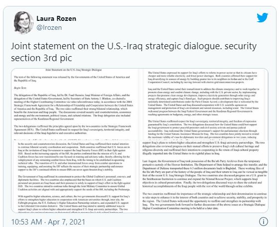 “US forces are in Iraq at the invitation of Iraqi Government to support the Iraqi Security Forces (ISF) in their fight against ISIS,” said a joint statement following the “strategic dialogue” between US Secretary of State Antony Blinken and his Iraqi counterpart Fuad Hussein on Wednesday.