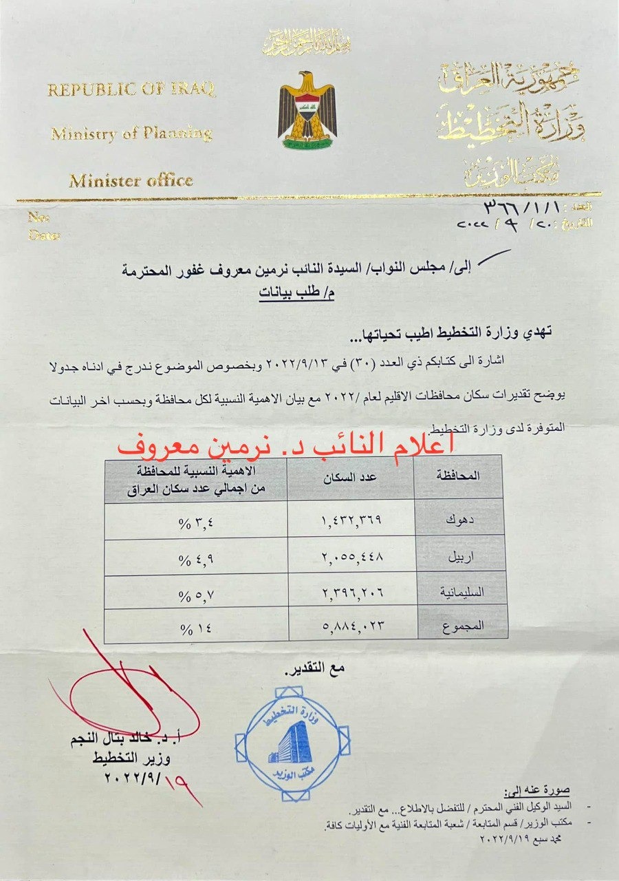 گرافیك: ژمارەی دانیشتوانی هەرێم بەپێی ئاماری وەزارەتی پڵاندانی عێراق